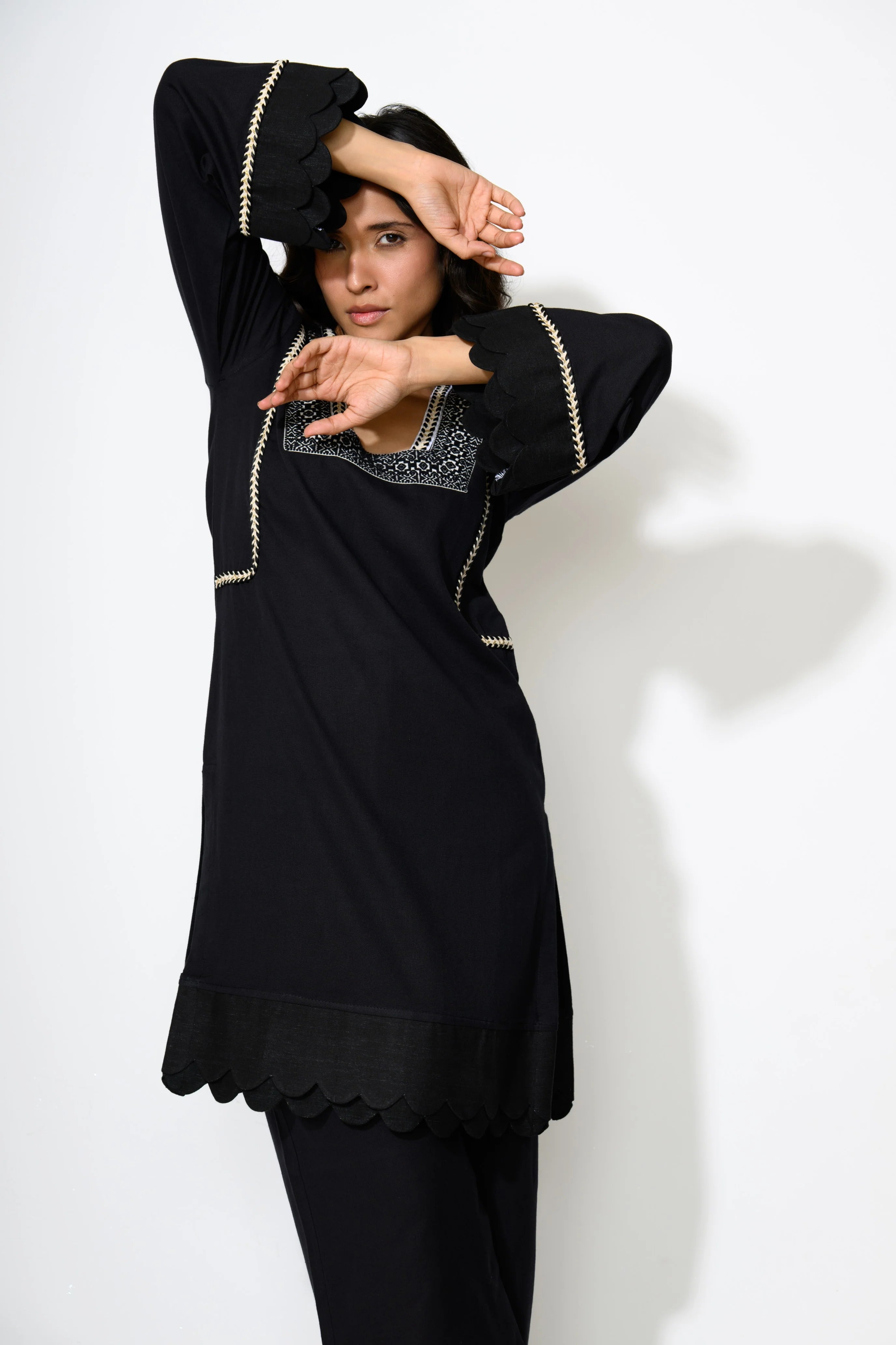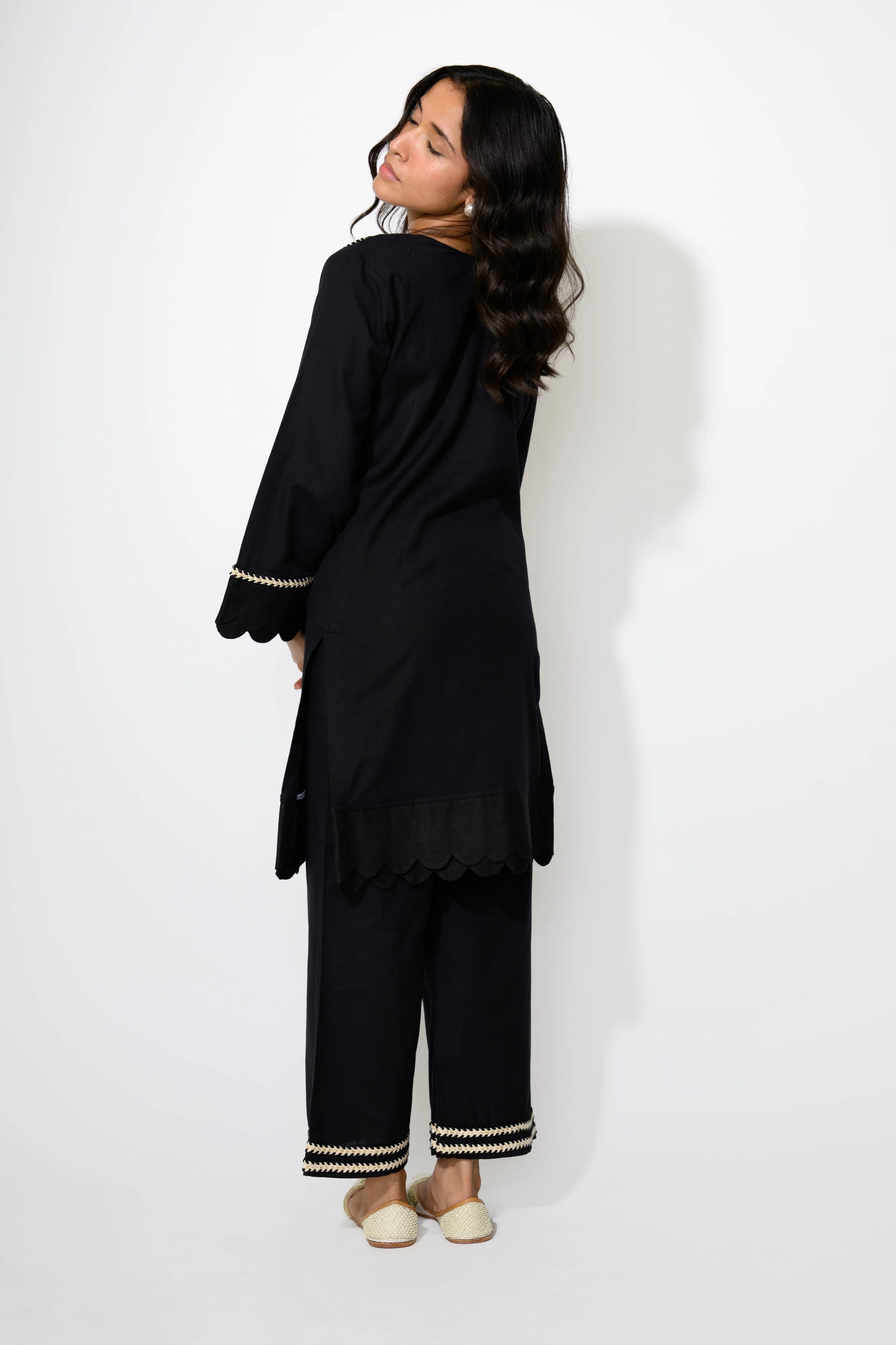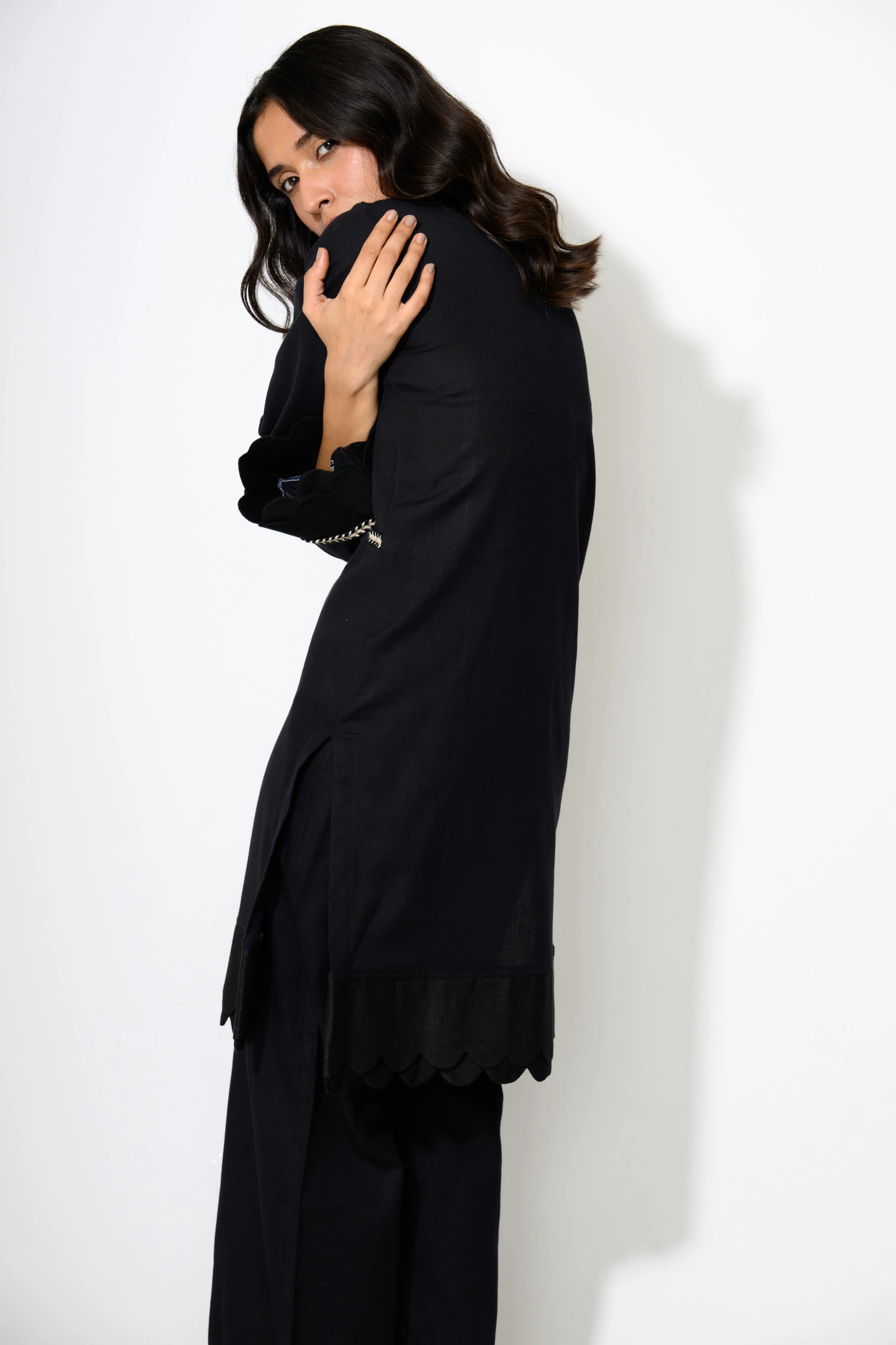 Sleek and understated, this black ensemble speaks volumes with minimal effort. The clean lines and versatile shape make it a wardrobe essential for both day and night. It's an ideal choice for those who favor monochrome magic with a modern twist!