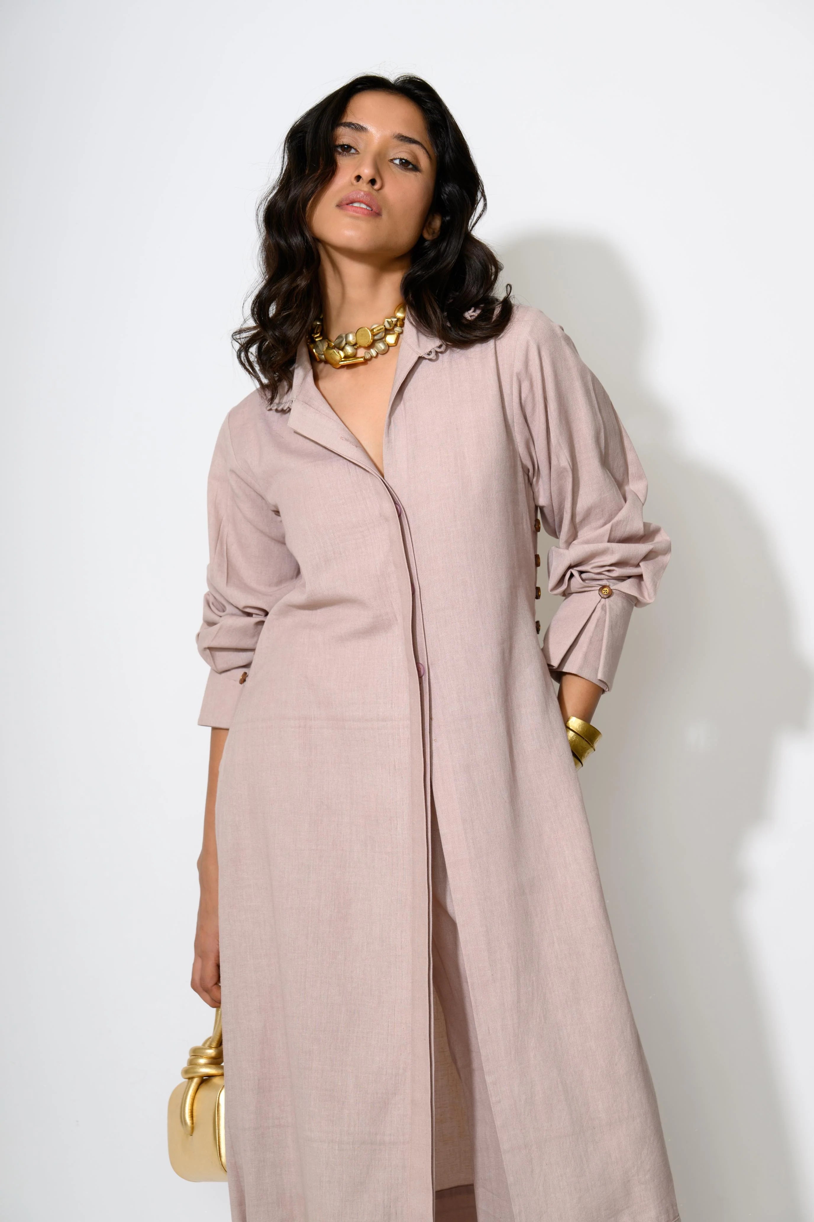 Step into subtle sophistication with the Rose Dusk Linen Set, a breezy coord ensemble in a soft blush hue. The longline shirt tunic flows effortlessly over wide-leg trousers, while understated pleats at the hem add textural charm. A trail of delicate wooden-toned buttons along the side seam—a quiet detail that makes it chic & classy! Designed for ease, tailored for presence