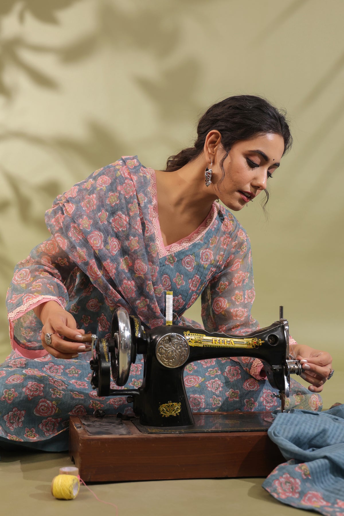 Celebrate timeless charm with this Greyish Blue Printed Kota Doria Suit, a perfect blend of traditional artistry and modern comfort: