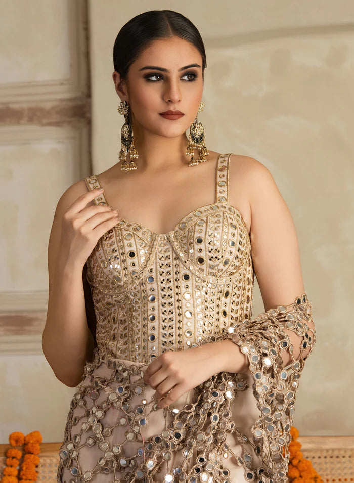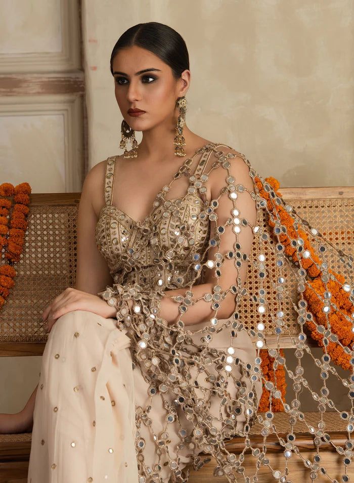 Lightweight and radiant, this pre-tied georgette saree redefines occasionwear ease. Its pleated structure flows naturally while the pallu is edged with intricate beadwork lace. The corset blouse, padded for support, features a criss-cross dori back that combines structure with sensuality. Cutdana embroidery and chita accents add depth to the airy fabric, giving it a subtle sheen. This ensemble transitions seamlessly from day celebrations to evening parties. Pair it with crystal drop earrings and metallic heels for an elevated finish. Designed for effortless grace and movement, it embodies modern Indian couture at its most fluid and flattering.