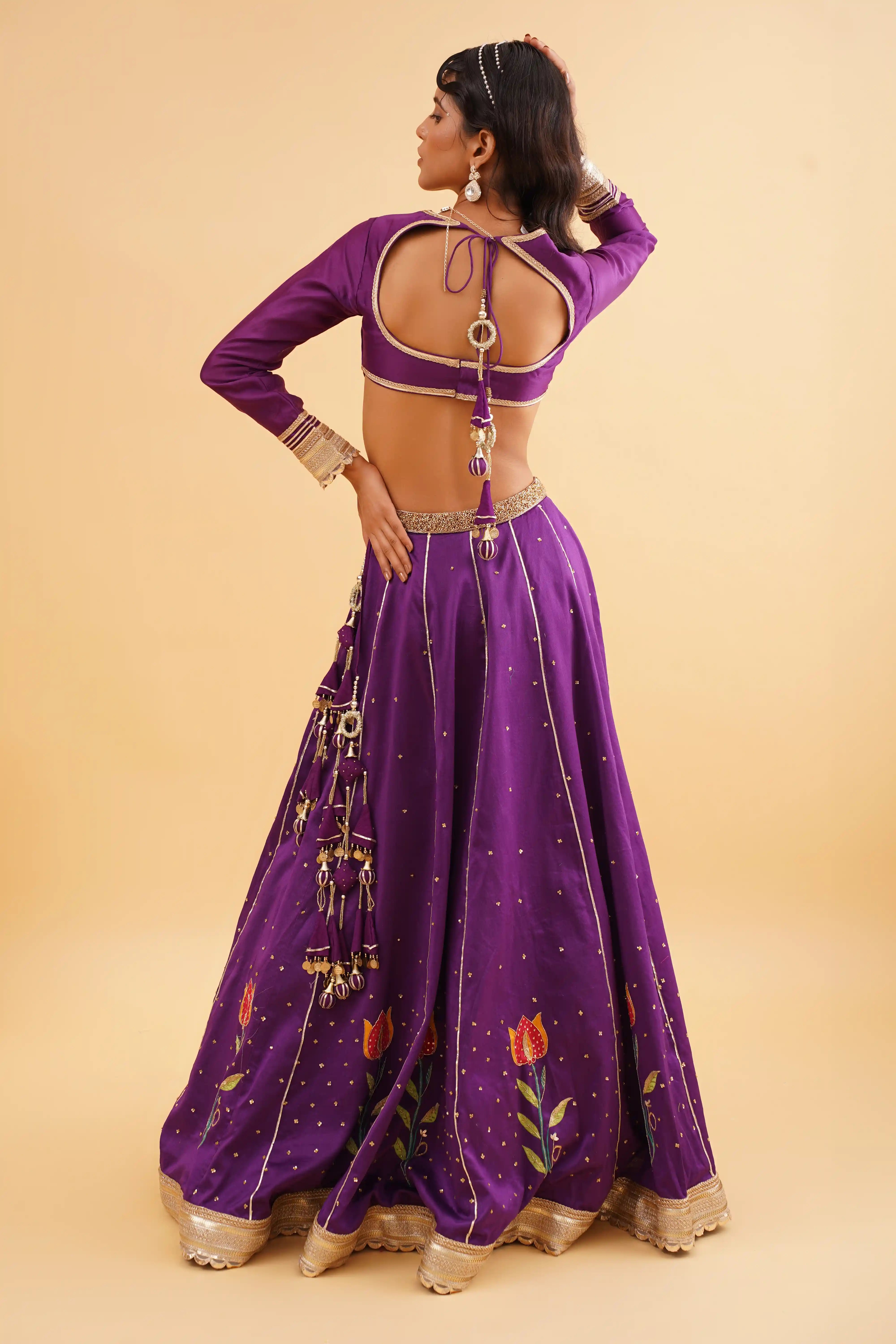 - Hand-detailed tulip motifs scattered across the lehenga