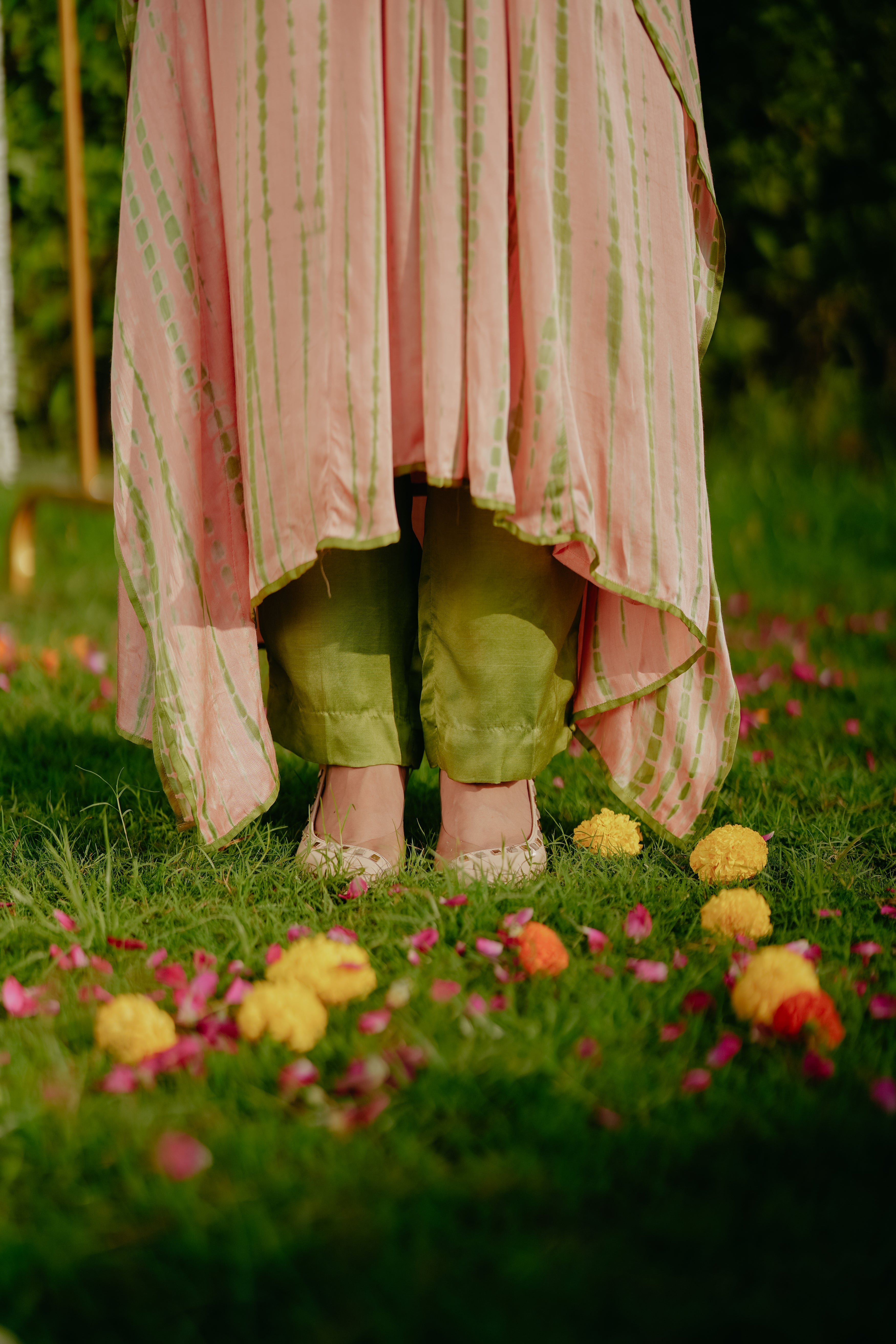 Make a lasting impression at any celebration with our exquisite pink and green satin outfit.