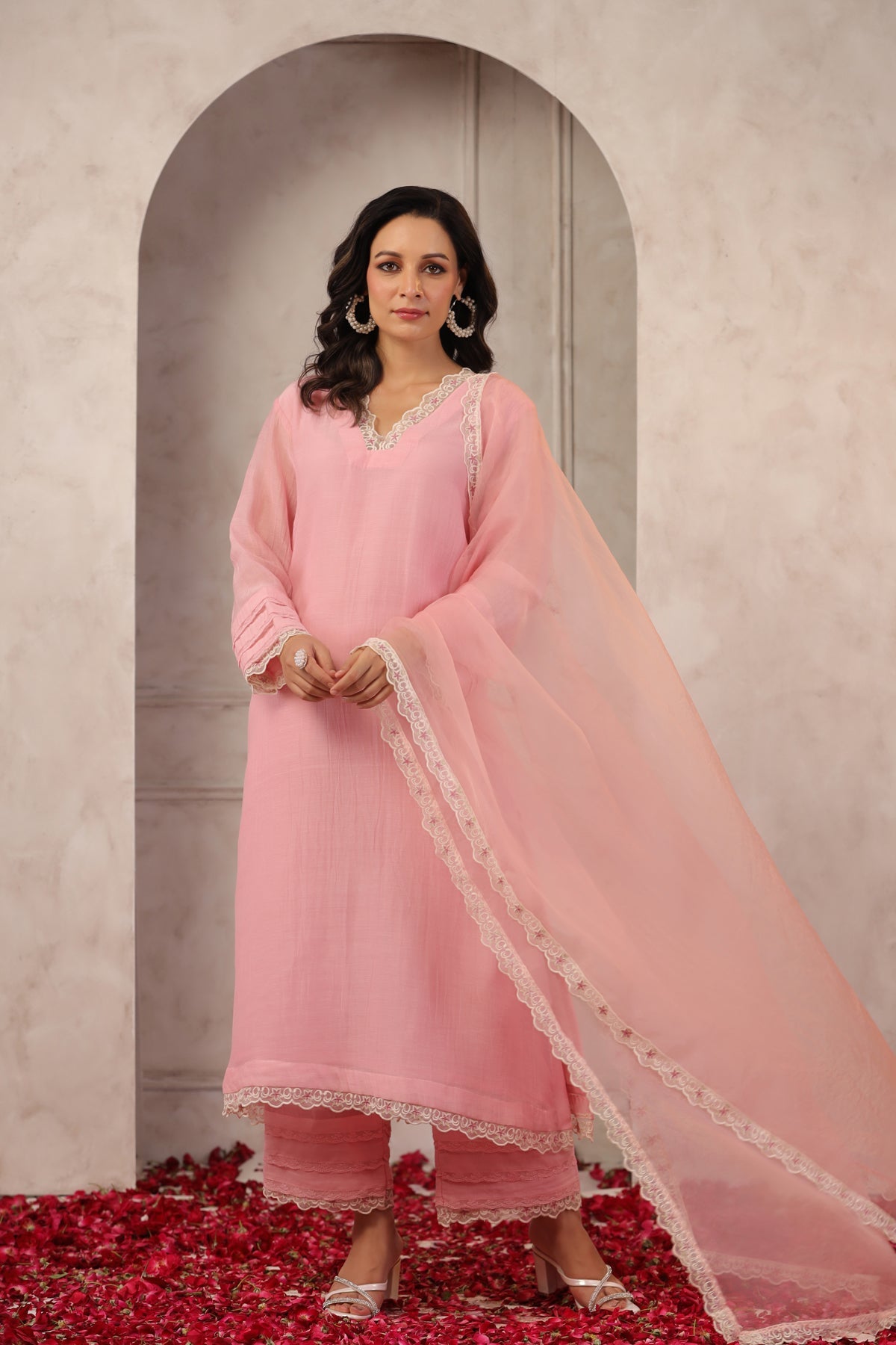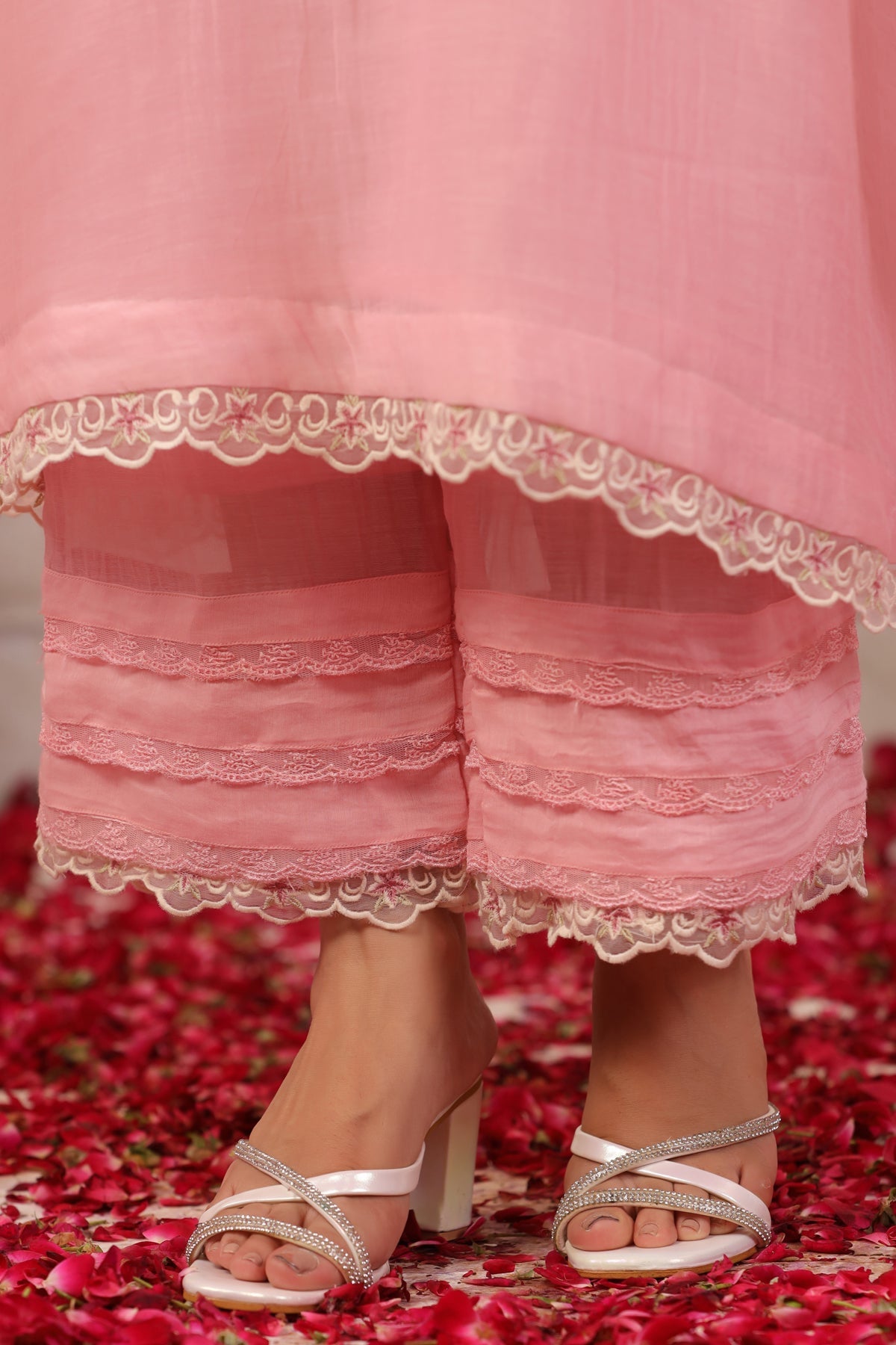 This elegant outfit features a stunning chanderi kurta with delicate floral threadwork detailing along the neckline, hem, and sleeves. The kurta is a gorgeous shade of soft pink, complemented by a matching pair of loose-fitting pants with a lace-trimmed hem.