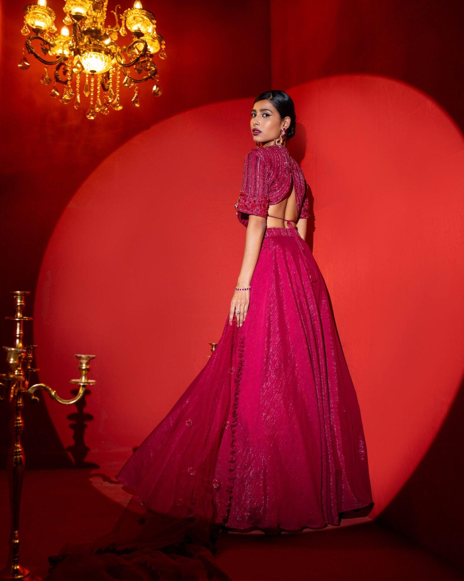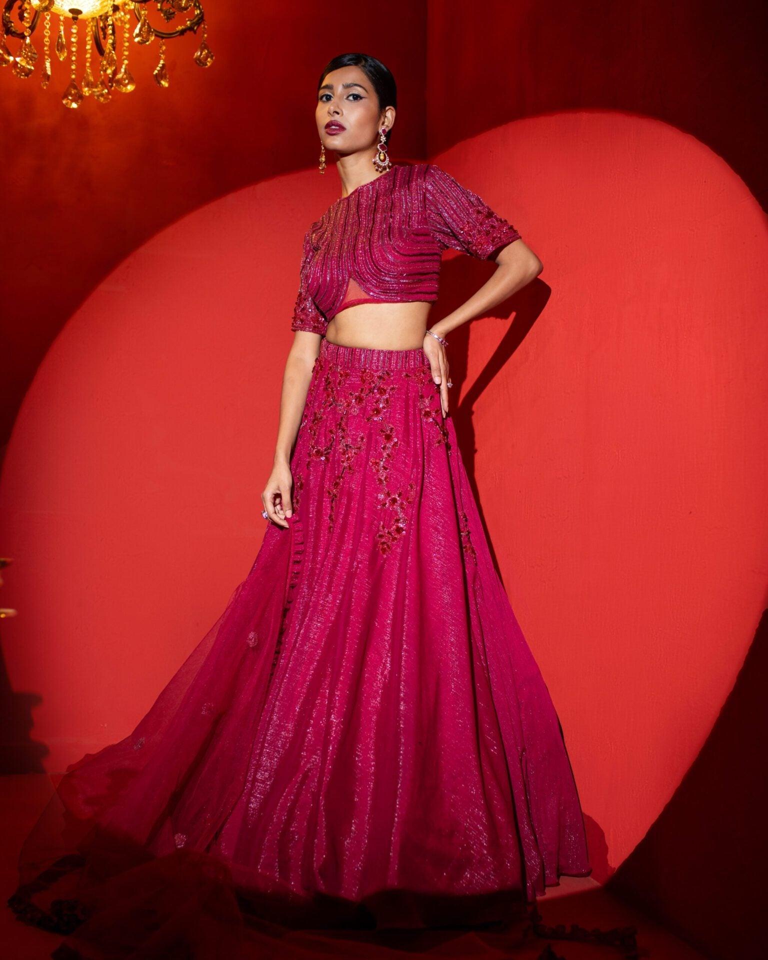 Exude everlasting charm with this flare lehenga skirt paired with a blazer style sequin top. The top is hand embroidered with poth using cutdana work technique. Around the waistline, a semi sheer organza panel provides a glimpse of the midriff, creating a flattering look. This ensemble's rich black hue adds an air of mystery and glamor, making it an ideal choice for formal occasions, weddings, and evening events where you want to make a lasting impression.