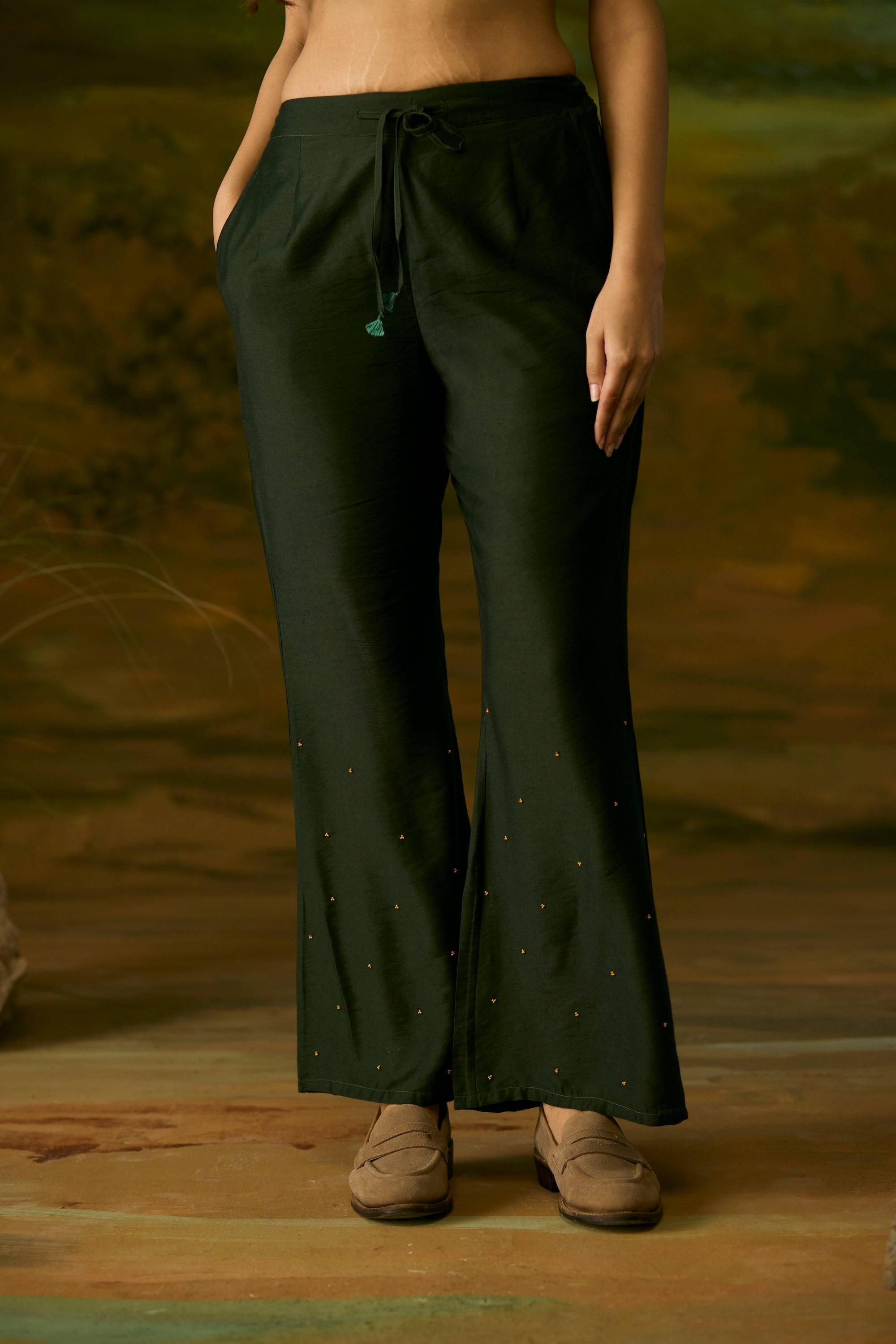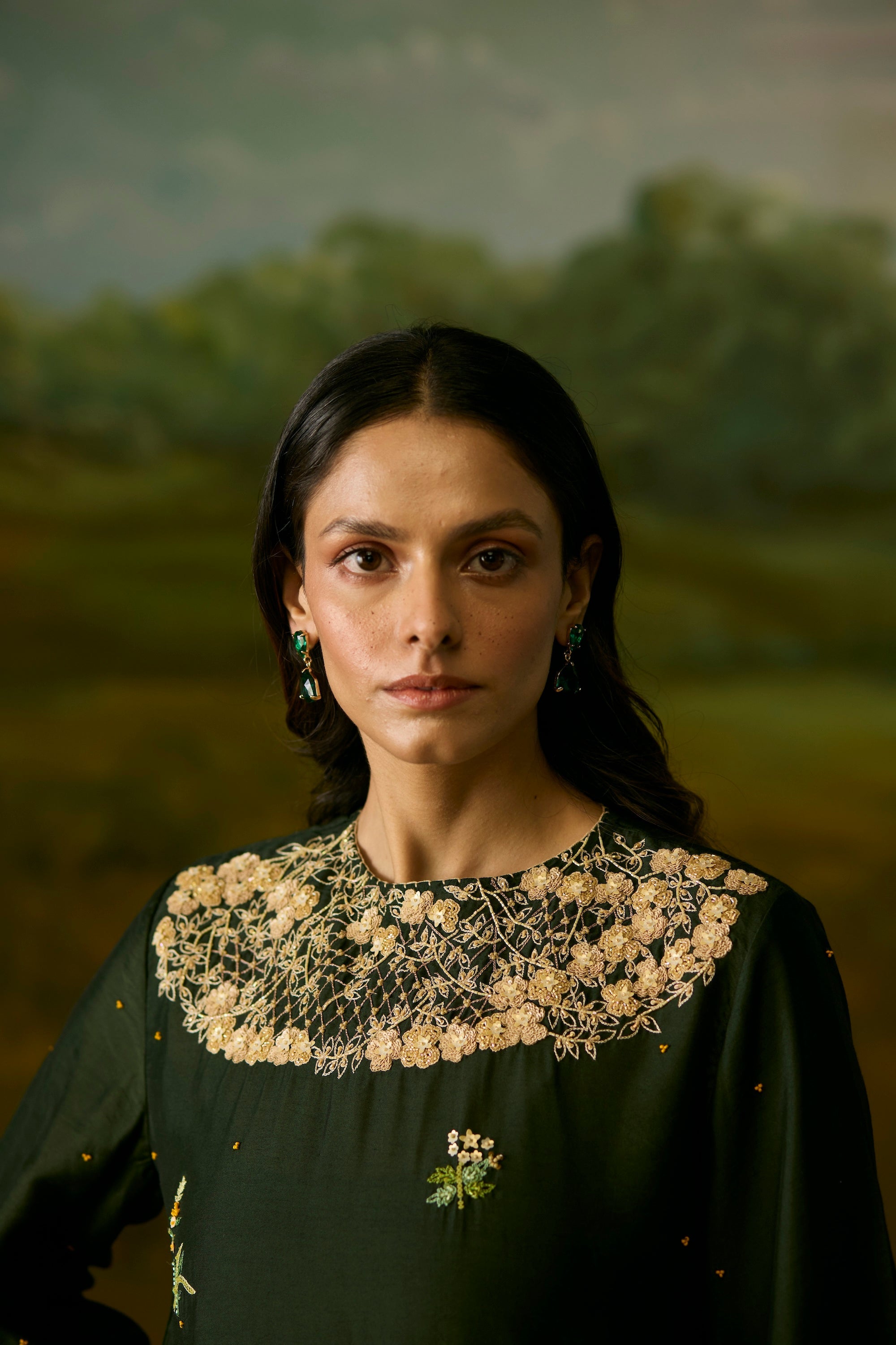 Crafted from fine chanderi, the Forest Green Kurta is adorned with contrasting embroidered detailing along the neckline, elevated by shimmering beaded accents. The front features delicate beaded floral motifs, while the voluminous sleeves are finished with intricate beading at the cuffs, adding a refined, celebratory touch.