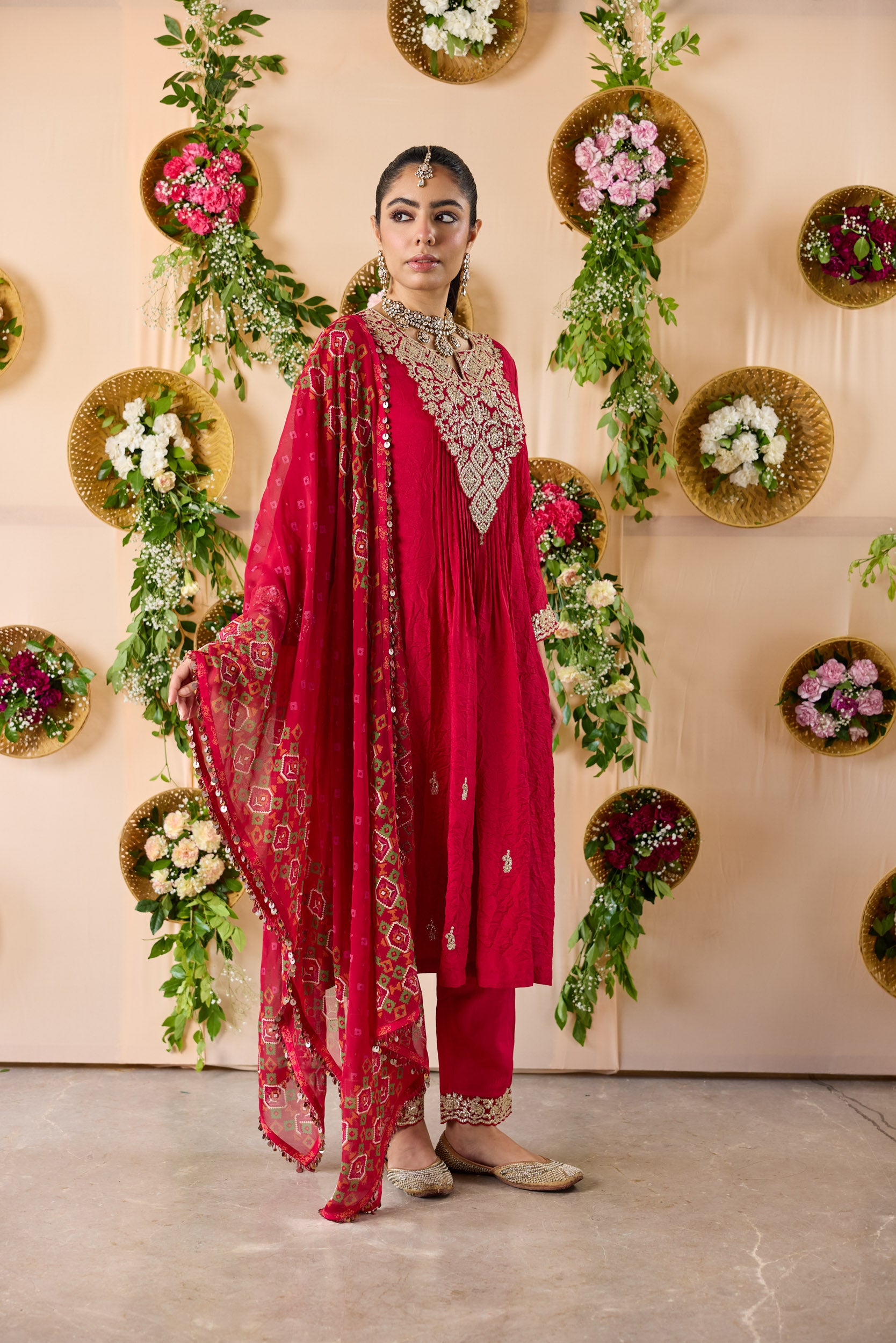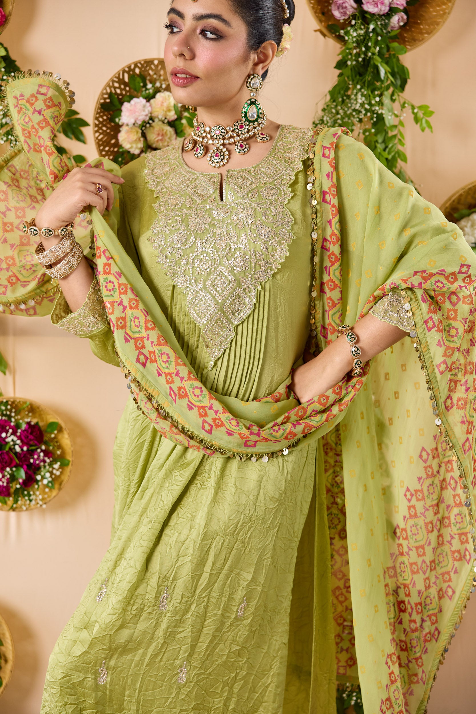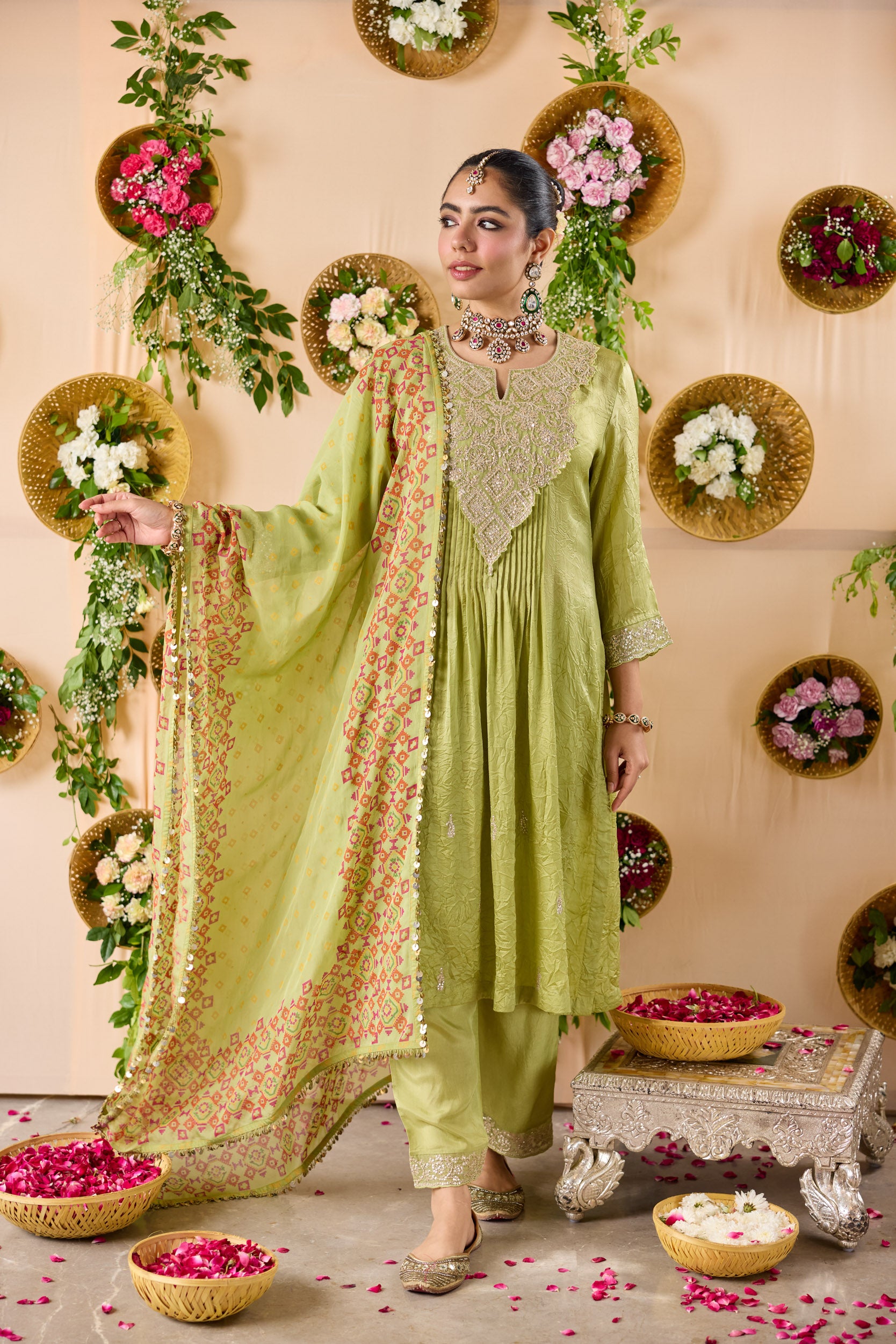 The Hariyali Kurta Set blooms in fresh pistachio green silk with intricate hand-embroidered detailing. A chevron-patterned yoke in silver gota patti frames the neckline, while signature pintuck pleating adds elegant vertical lines down the front. Embroidered silk pants and a coral-pink patola dupatta with phulkari-style geometric motifs complete this refreshing ensemble. Ideal for daytime celebrations, mehndi functions, or festive brunches.