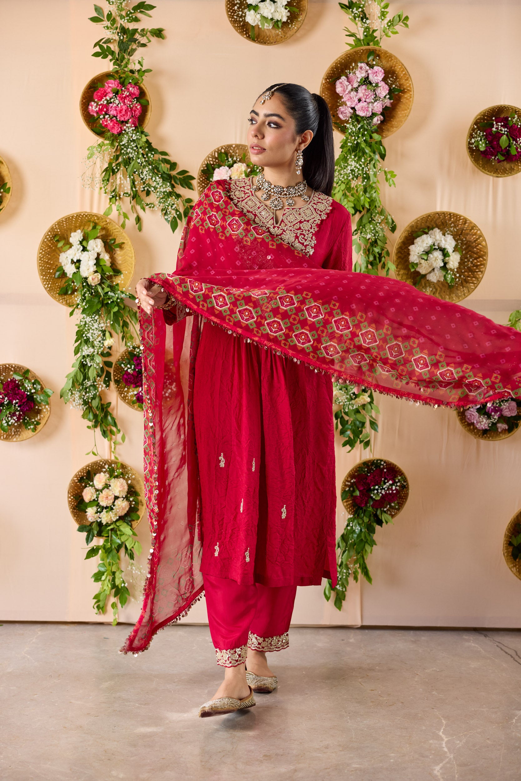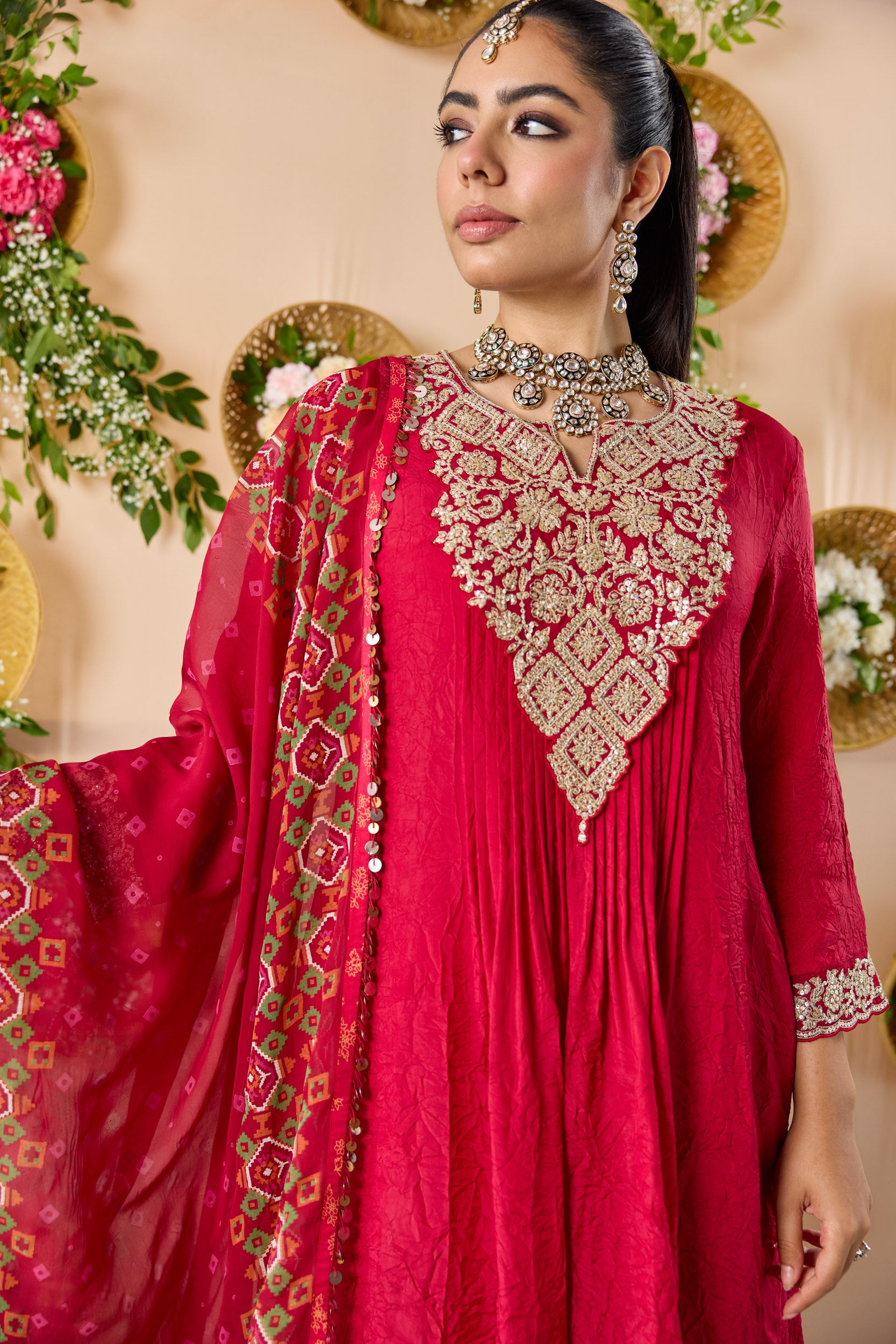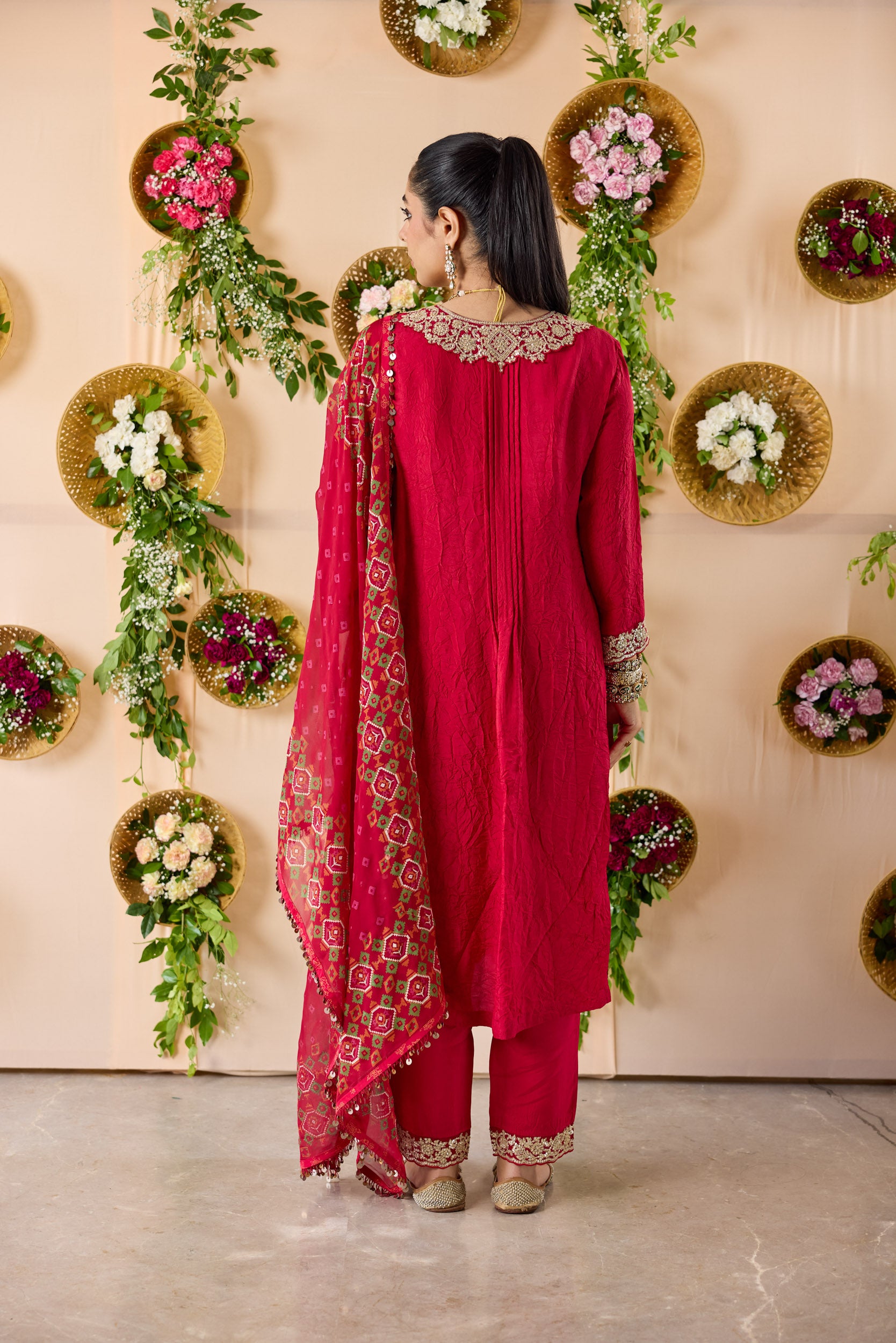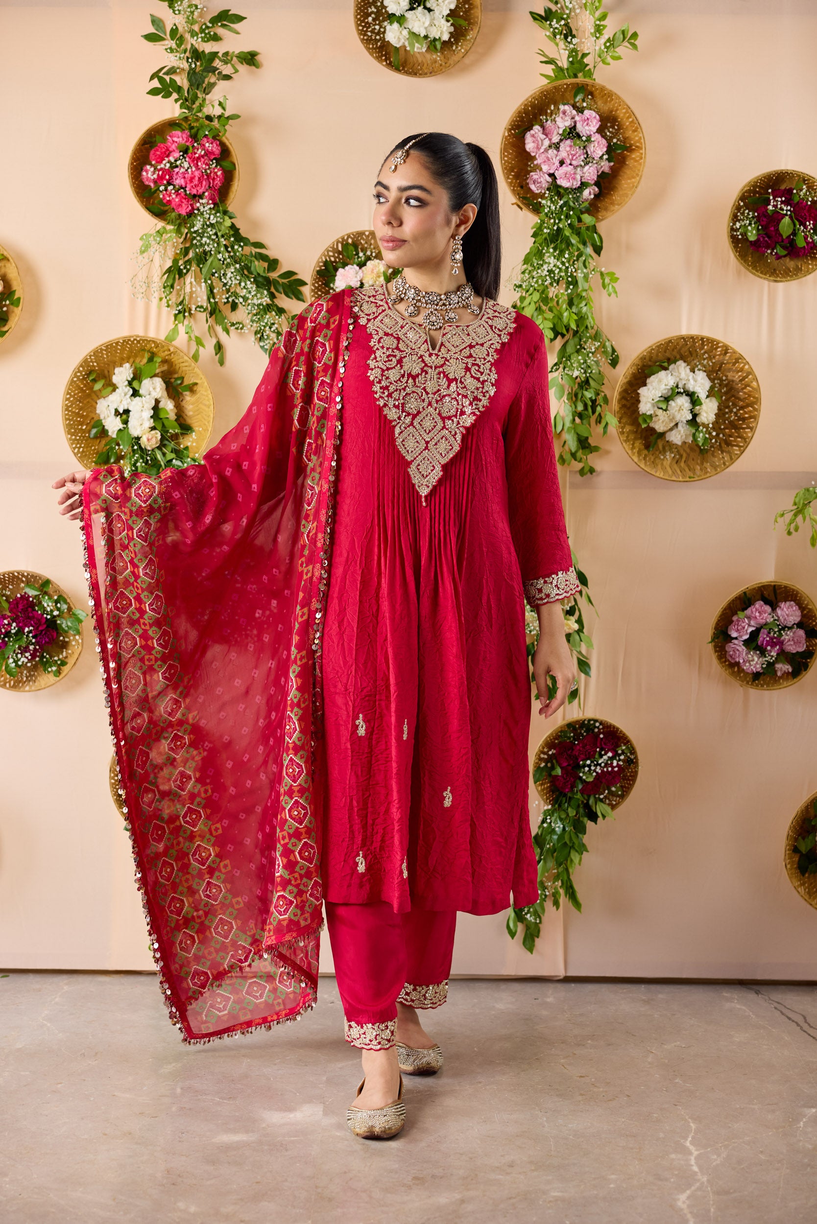 The Hariyali Kurta Set blooms in fresh pistachio green silk with intricate hand-embroidered detailing. A chevron-patterned yoke in silver gota patti frames the neckline, while signature pintuck pleating adds elegant vertical lines down the front. Embroidered silk pants and a coral-pink patola dupatta with phulkari-style geometric motifs complete this refreshing ensemble. Ideal for daytime celebrations, mehndi functions, or festive brunches.