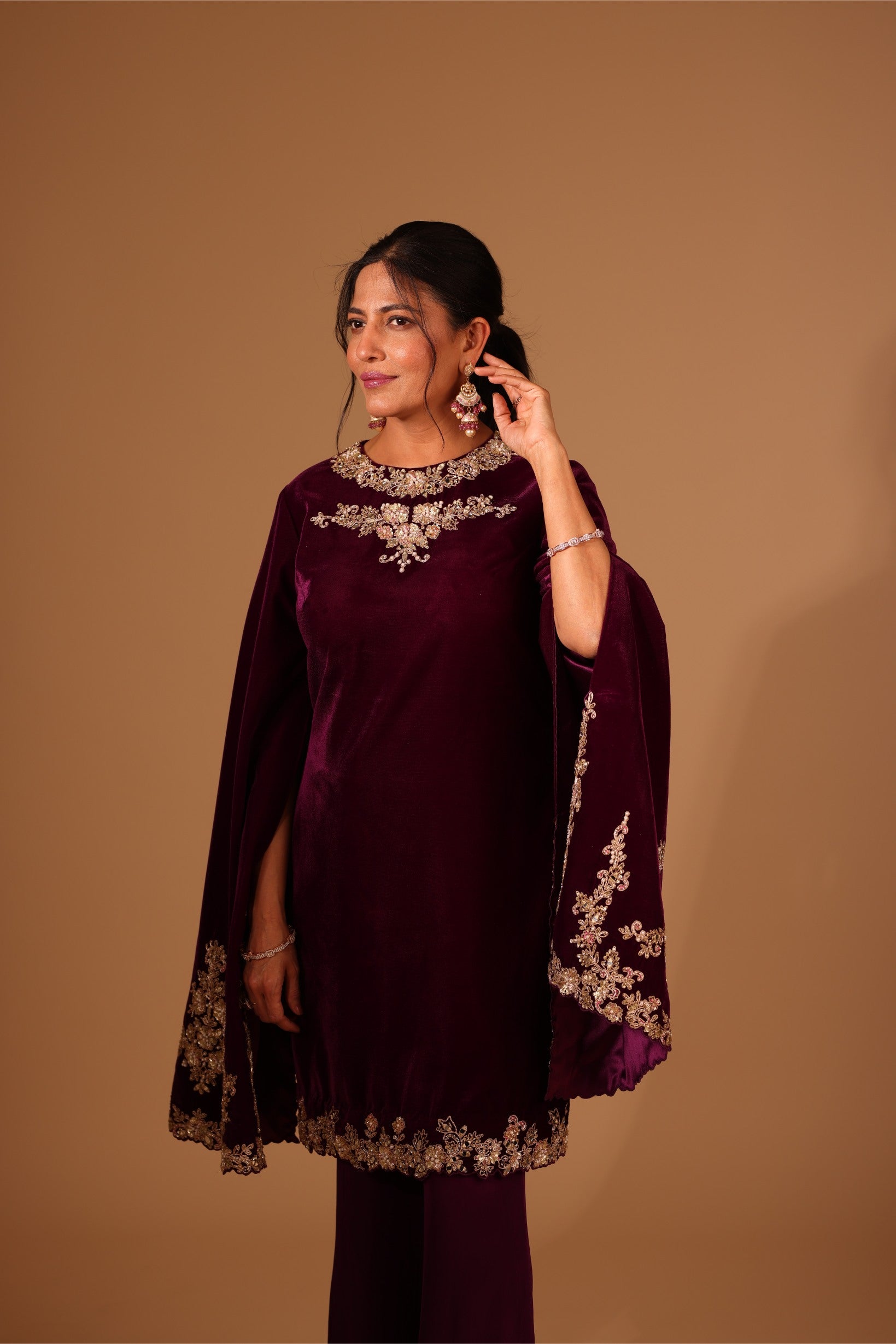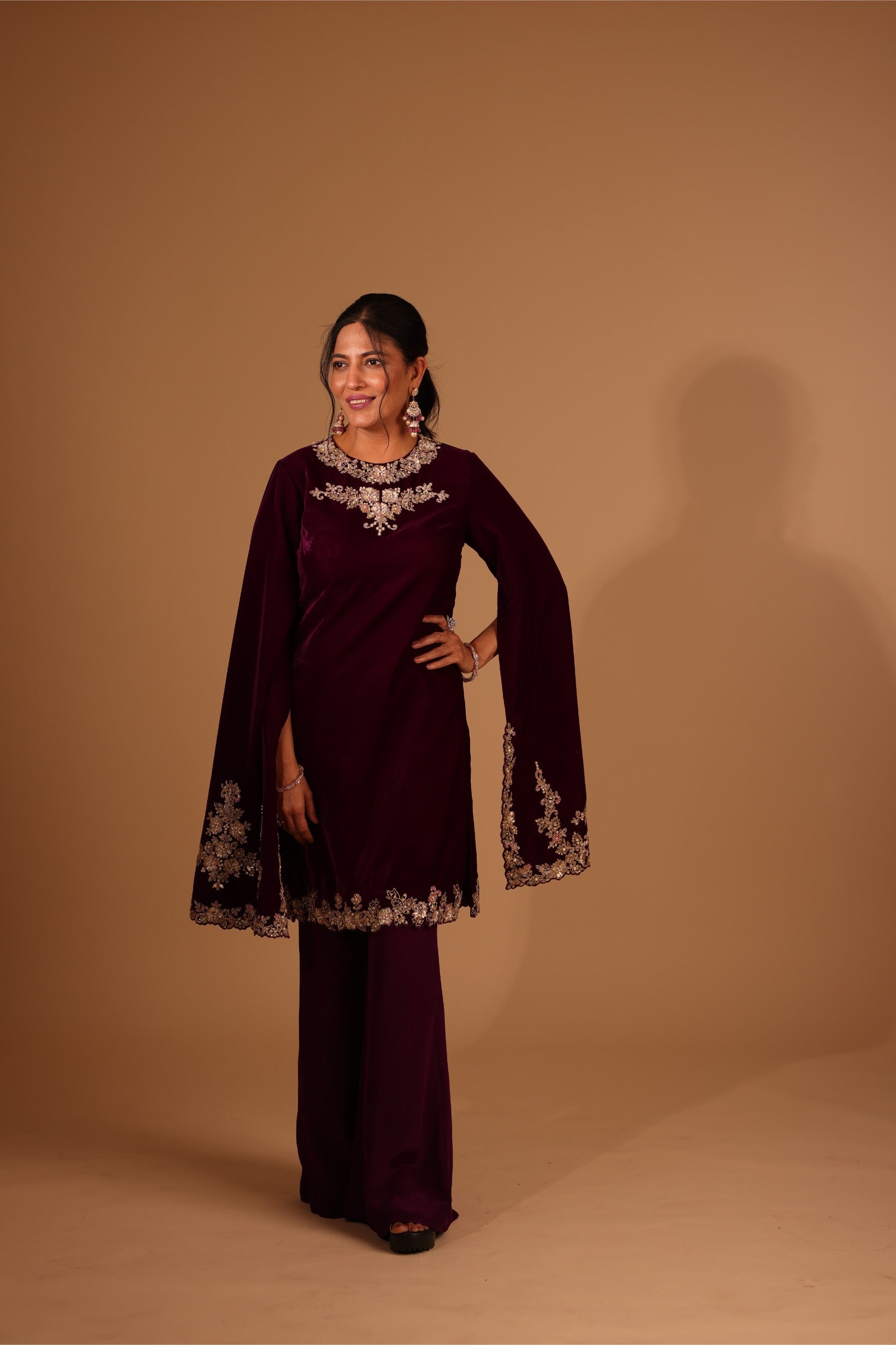 Kurta: A sophisticated cape style kurta crafted from sumptuous velvet. The cape detail drapes elegantly over the shoulders, creating a dramatic yet refined look. The rich velvet fabric adds depth and allure, catching the light with every movement.