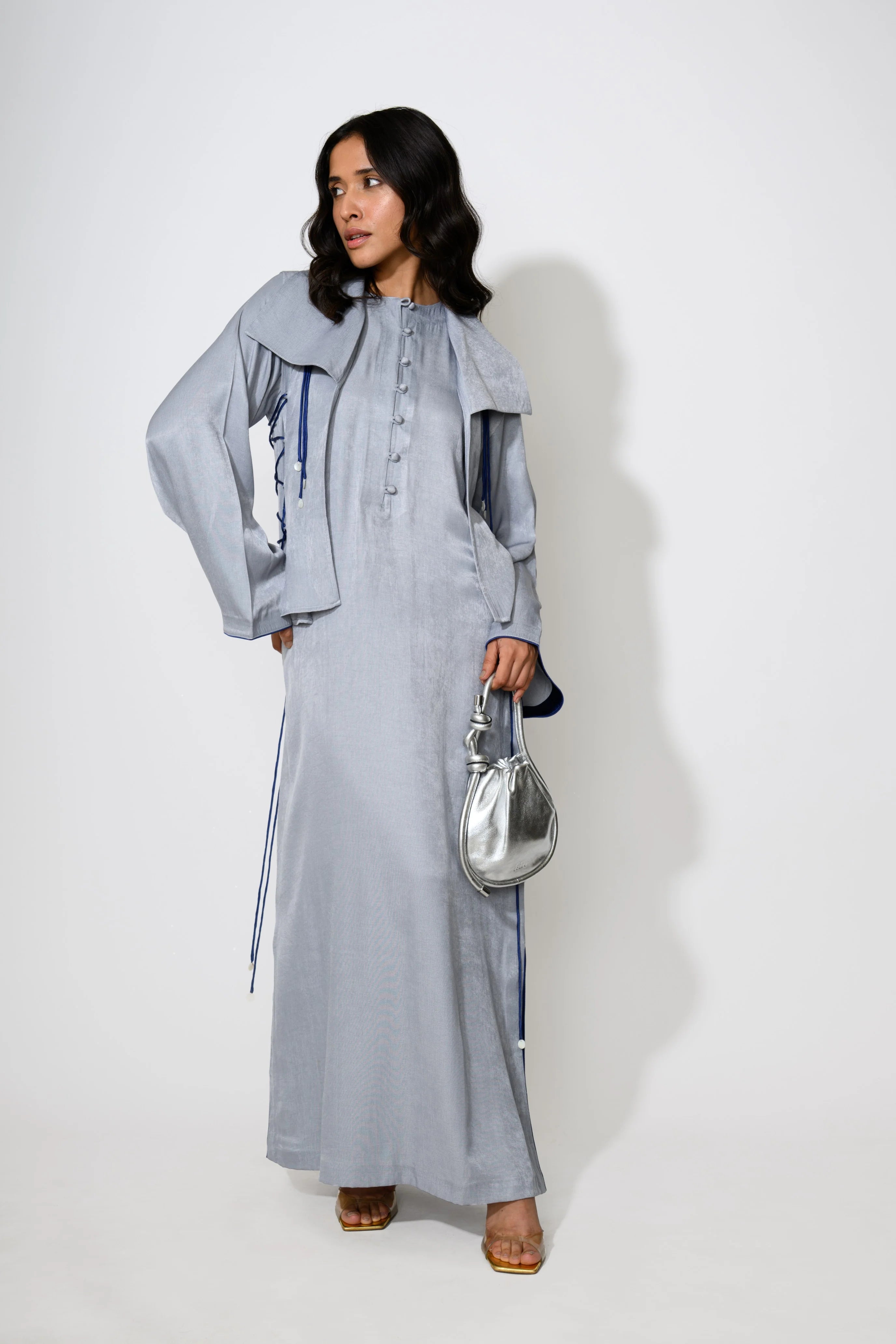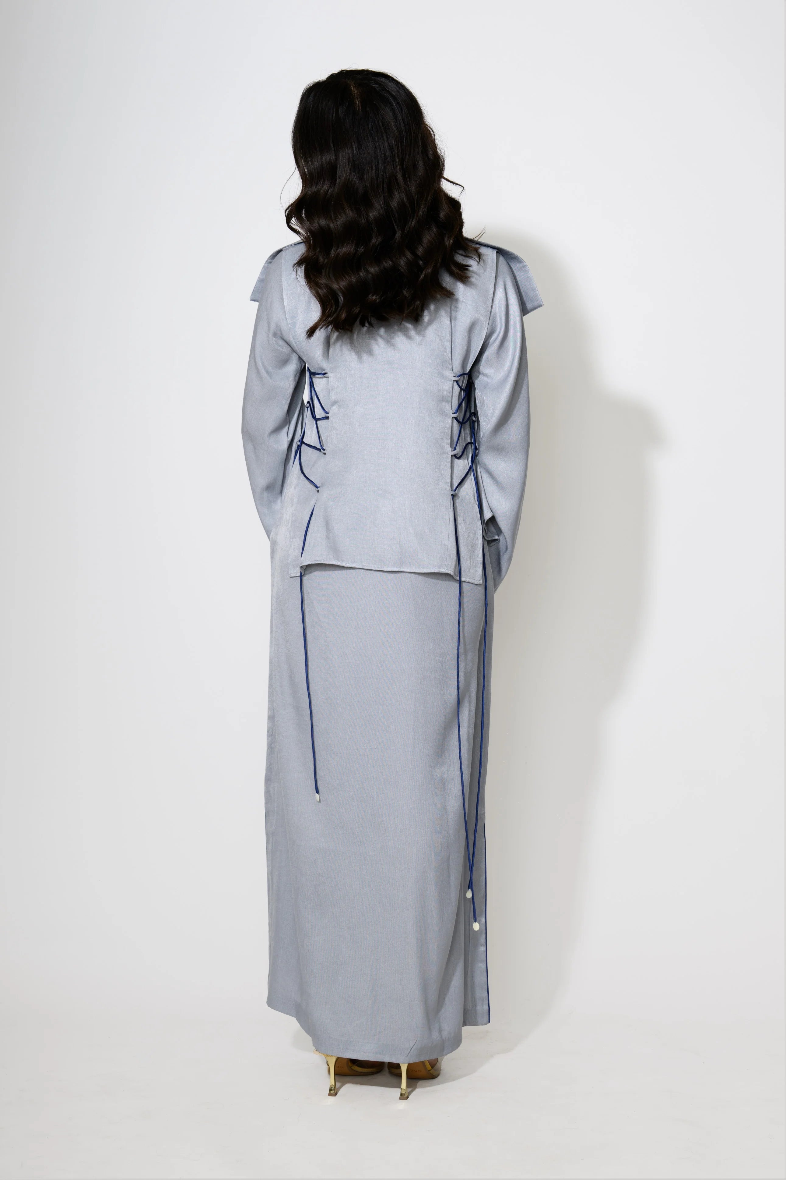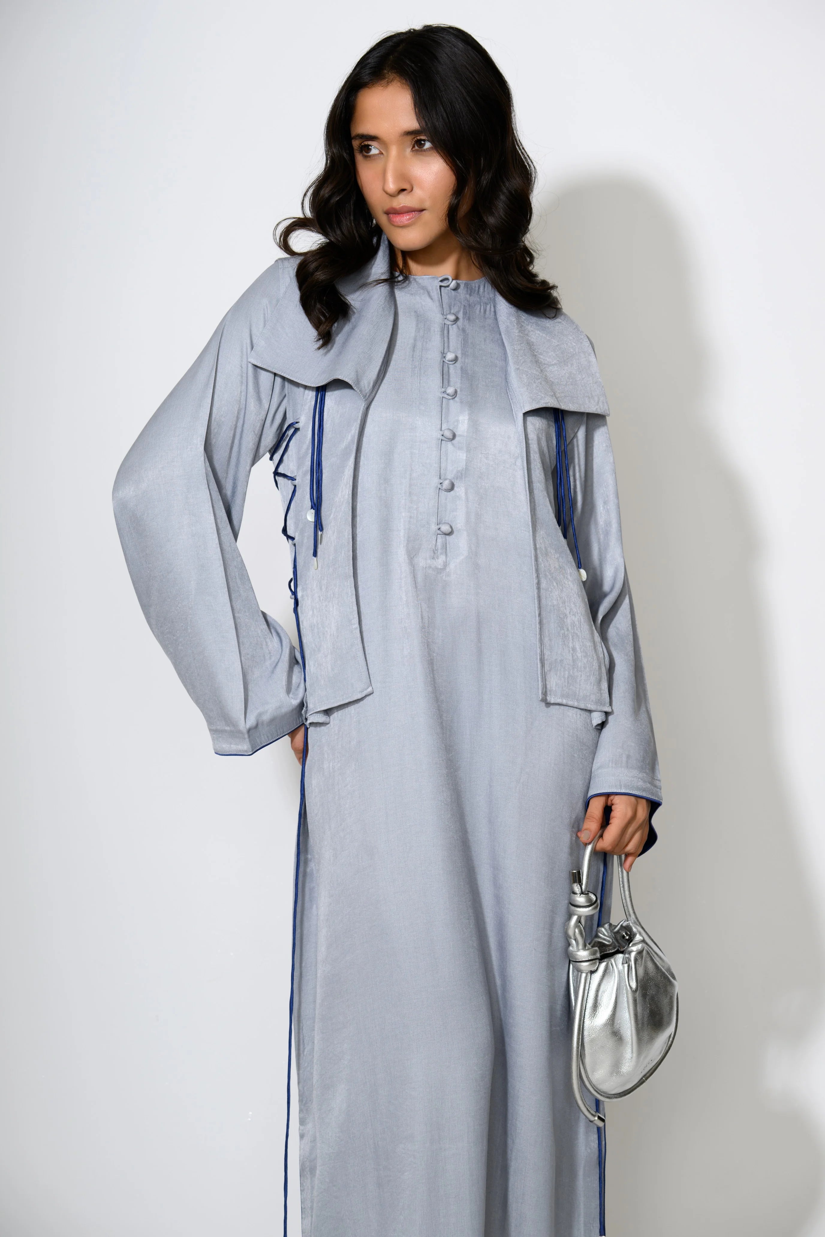 Command attention in Steel the Show, a two-piece cotton silk coord set that’s anything but ordinary. The sleek straight-cut dress flows effortlessly while the structured overlay jacket adds an unexpected twist with bold button details and adjustable side ties. Finished in a cool steel-blue hue with contrast accents, this set redefines understated drama—perfect for the ones who love to keep it minimal, but mighty