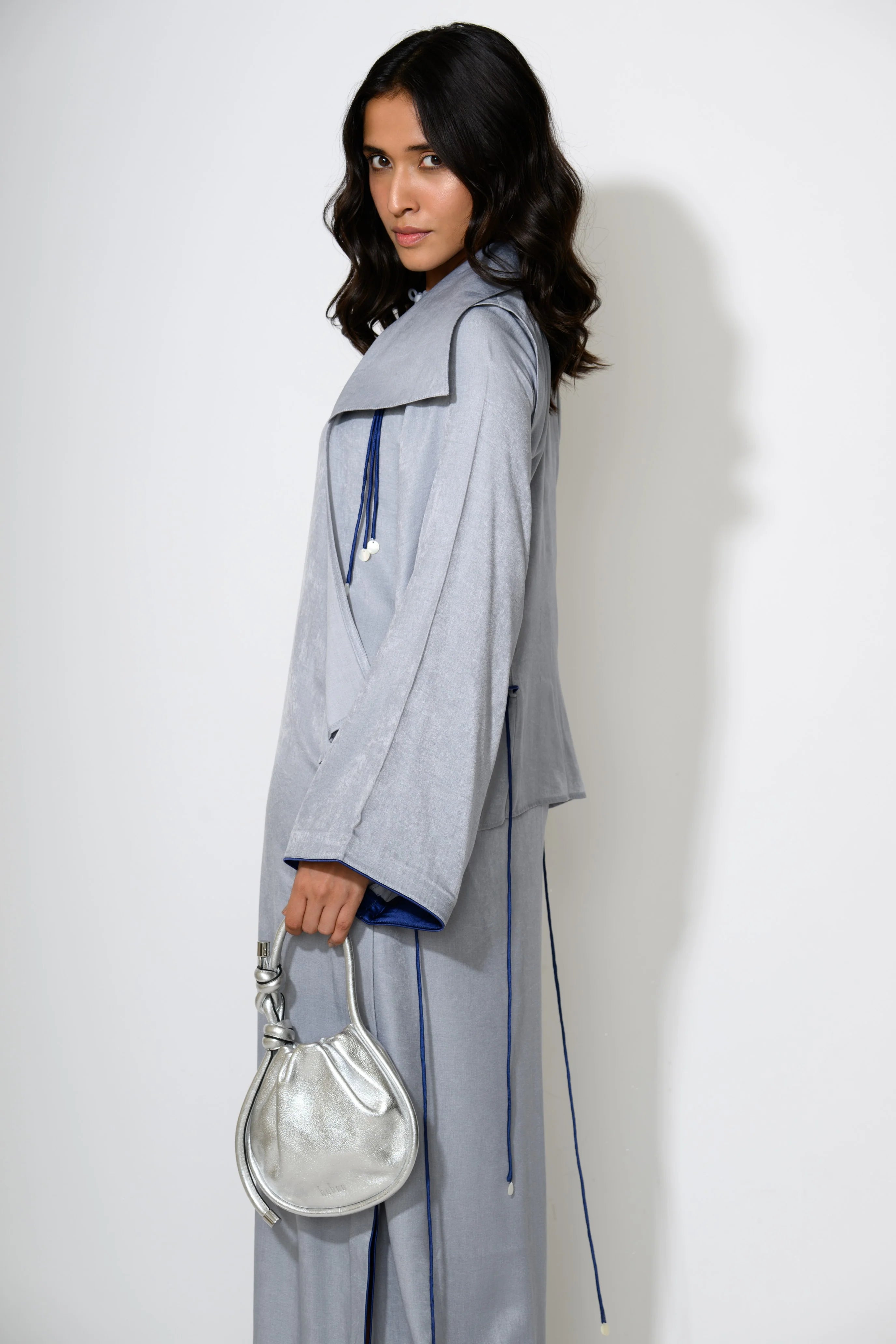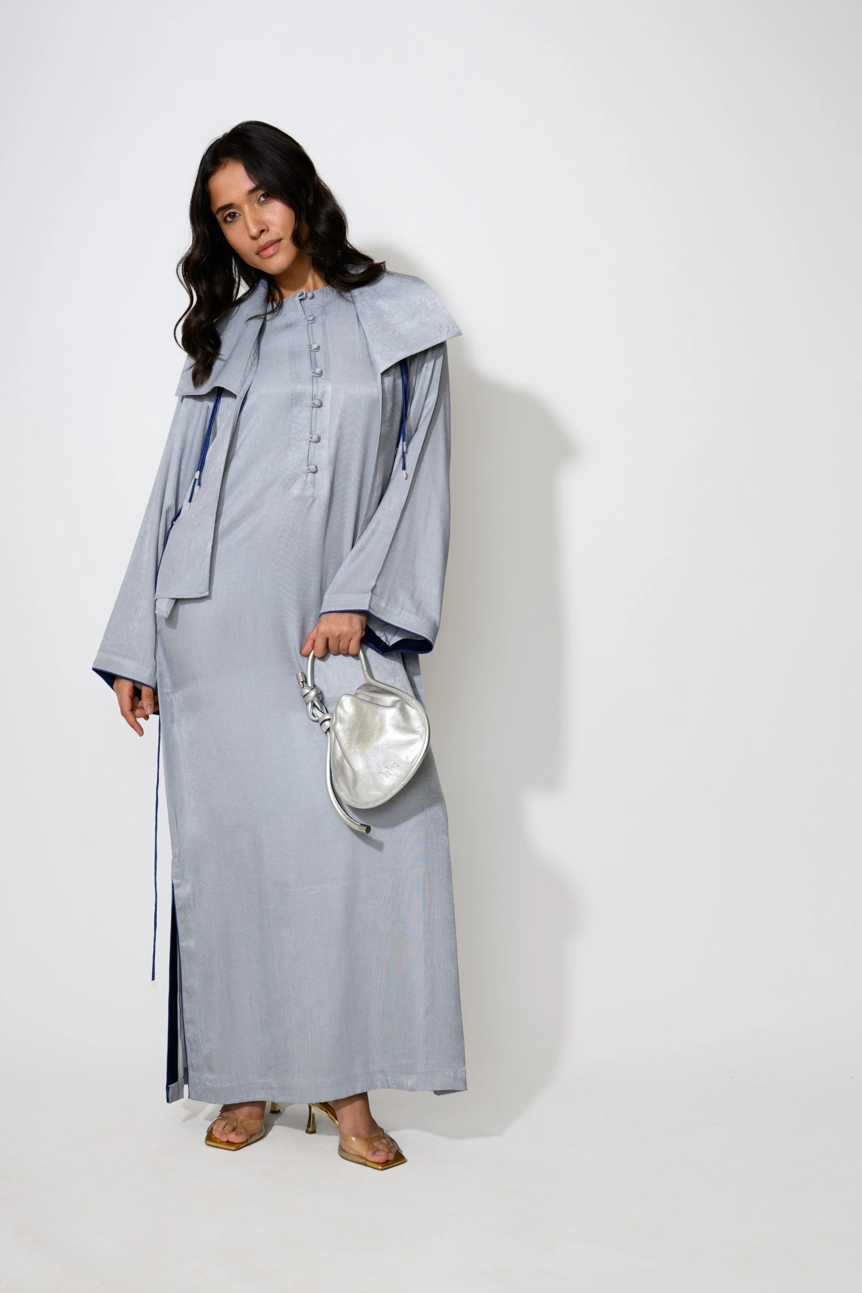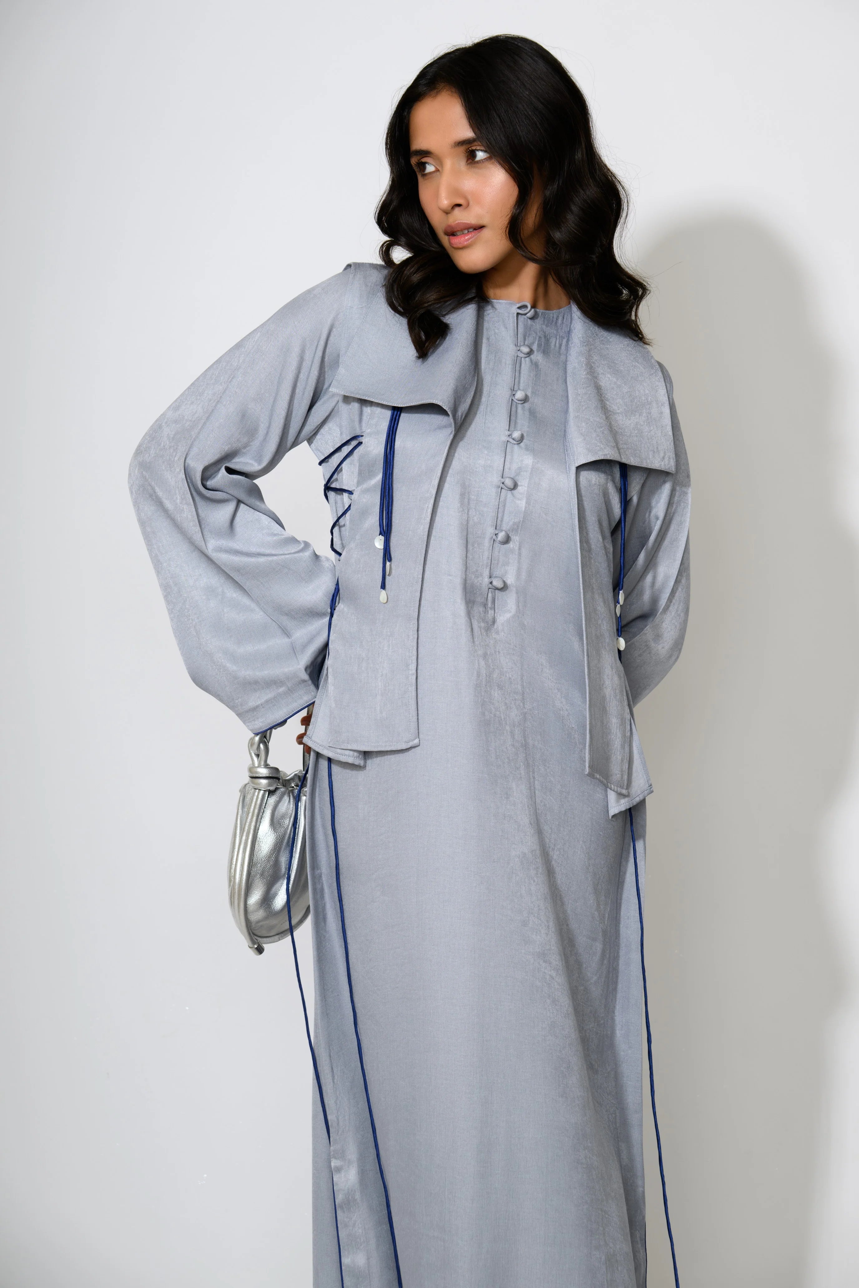 Command attention in Steel the Show, a two-piece cotton silk coord set that’s anything but ordinary. The sleek straight-cut dress flows effortlessly while the structured overlay jacket adds an unexpected twist with bold button details and adjustable side ties. Finished in a cool steel-blue hue with contrast accents, this set redefines understated drama—perfect for the ones who love to keep it minimal, but mighty