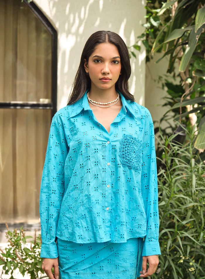 Shirt: Collared buttoned down shirt with crochet pockets Details- Crochet pockets, blue buttons Skirt: Matching skirt with tie knot detaling, back elastic and side zip